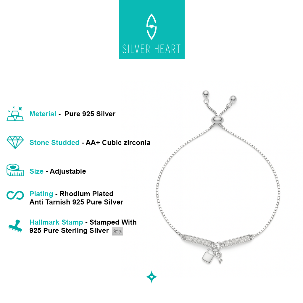 SILVER HEART 925 Sterling Silver BIS Hallmarked Rhodium Plated Lock and Key Bracelet | Adjustable Elegant Design for Women , Girls & Gifting